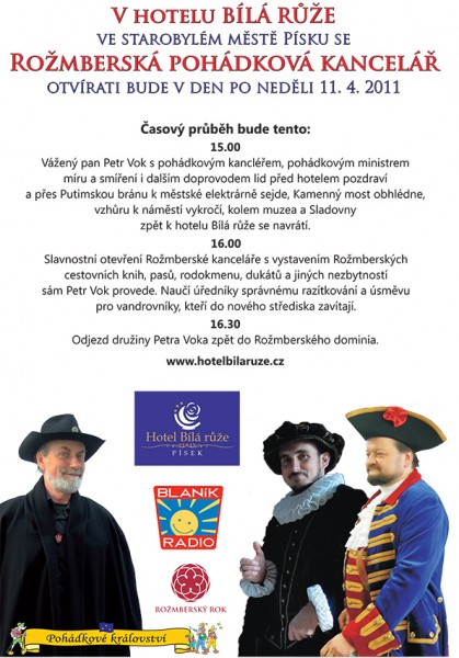 ![]() | Otevření pohádkové kancelářeNa zajímavý a pro návštěvníky atraktivní nápad přišli v Písku. Po zkušenostech z minulých let se zde vedení Hotelu Bílá Růže rozhodlo otevřít čtyřiadvaceti hodinový nepřetržitý servis pro návštěvníky a navíc i pravidelně pořádat akce v rámci projektu Rožmberský rok.... celý článek |